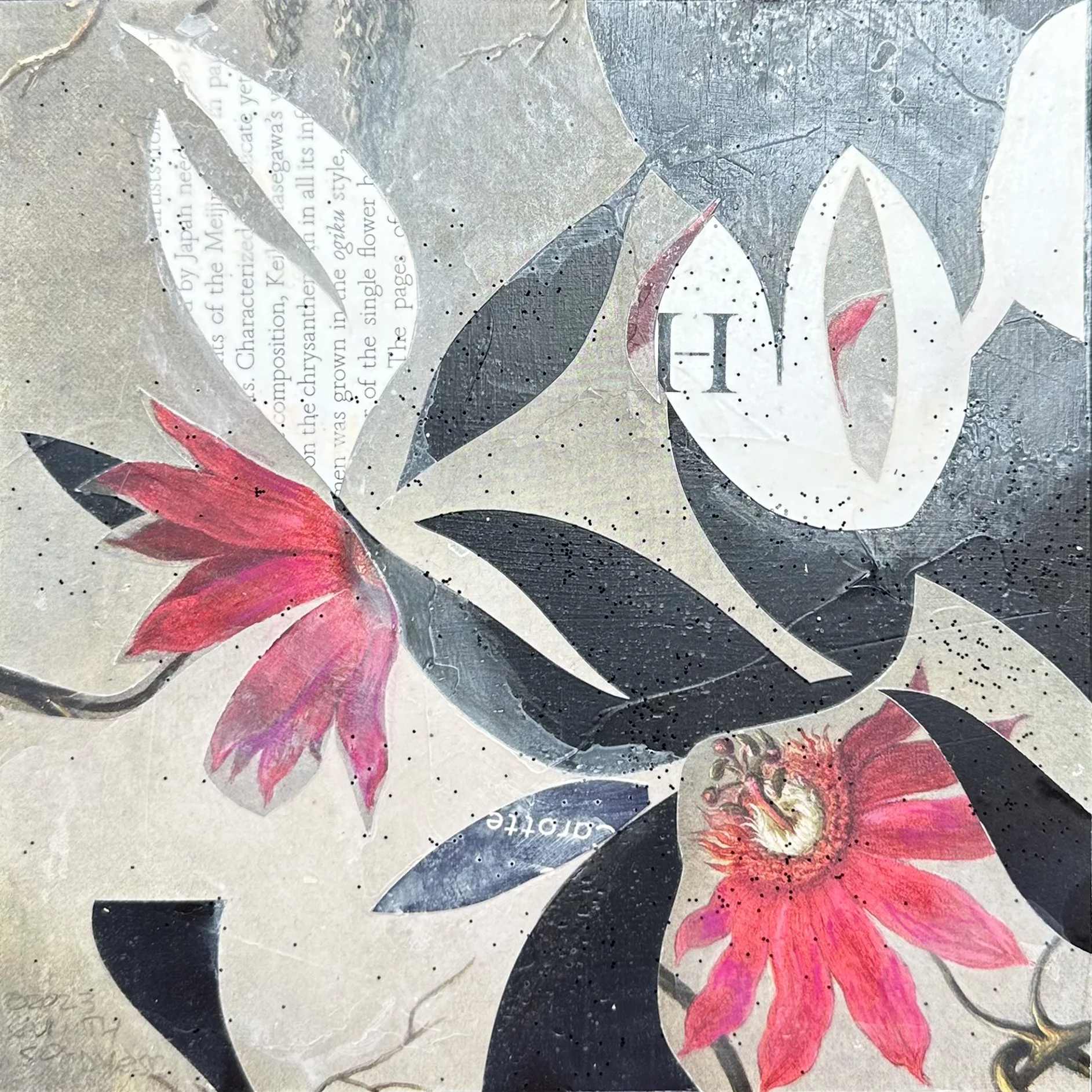 This series is an evolution of the Botical Camouflage pieces, but smaller and more intimate. I started this series thinking about a handful of close women friends whose friendships are important to me, and it bloomed from there (pun intended!) I use pages from “The Book of the Flowers: Flowers in Art” by Hyland and Wilson. I normally take two or three famous works and re-compose them to form my own bouquets, and work with a combination of acrylic, pastels and glitter to make them a whole new piece.